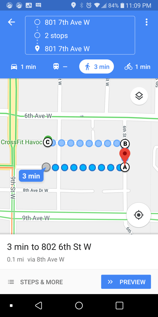 Run Around Block, about 400 meters (Out Front door, Go to left on 8th Ave W, Turn left on 6th St W, Turn Left on 7th Ave W and Return in Back of Building.)